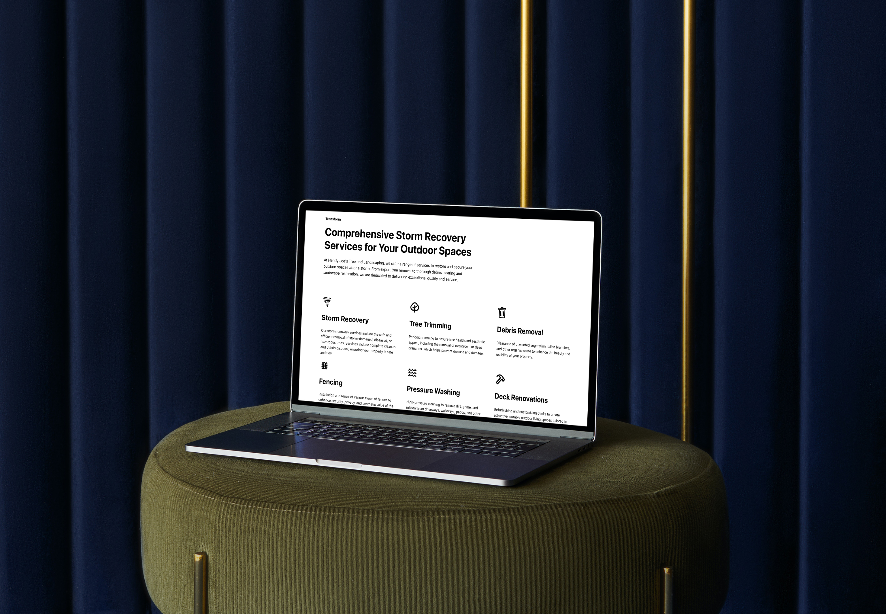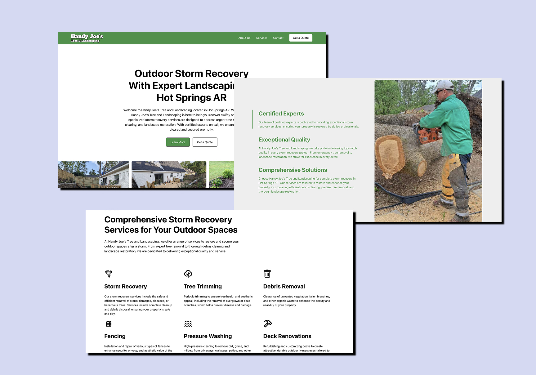 Handy Joe’s Landscape and Storm Recovery is a local service business specializing in professional landscaping, lawn maintenance, and post-storm cleanup. They needed a modern website that built trust, highlighted their services, and captured leads—especially from customers searching online for urgent storm recovery or yard care solutions.I created a clean, mobile-friendly website tailored for contractor and landscaping businesses.