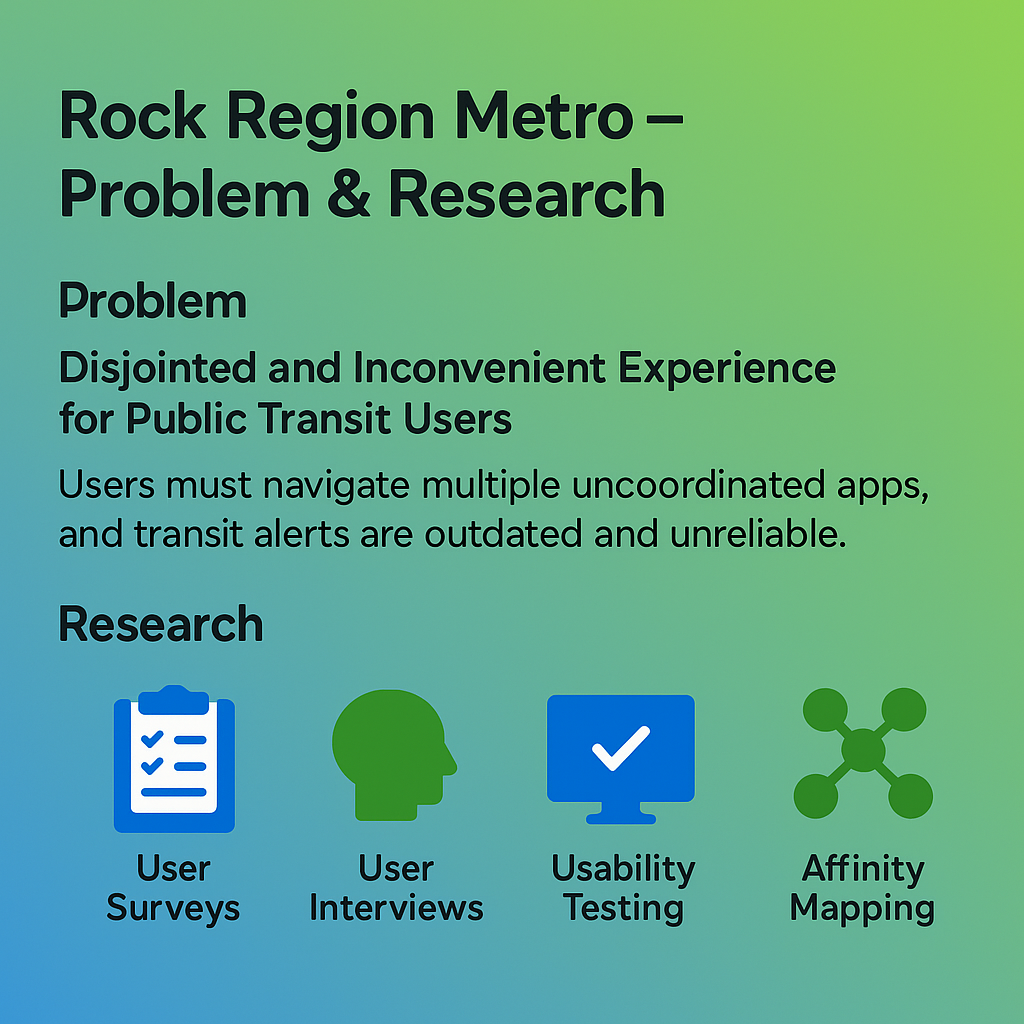Rock Region METRO faced a 30% drop in ridership and a 20% reduction in drivers — a challenge compounded by fragmented digital tools that made navigating the transit system frustrating for users. Through user surveys, interviews, usability testing, and affinity mapping, we uncovered a major barrier: riders were forced to use separate apps for bus routes, ride scheduling, and fare payments. On top of that, alerts were outdated, notifications were unreliable, and key features redirected users to clunky web-based systems.